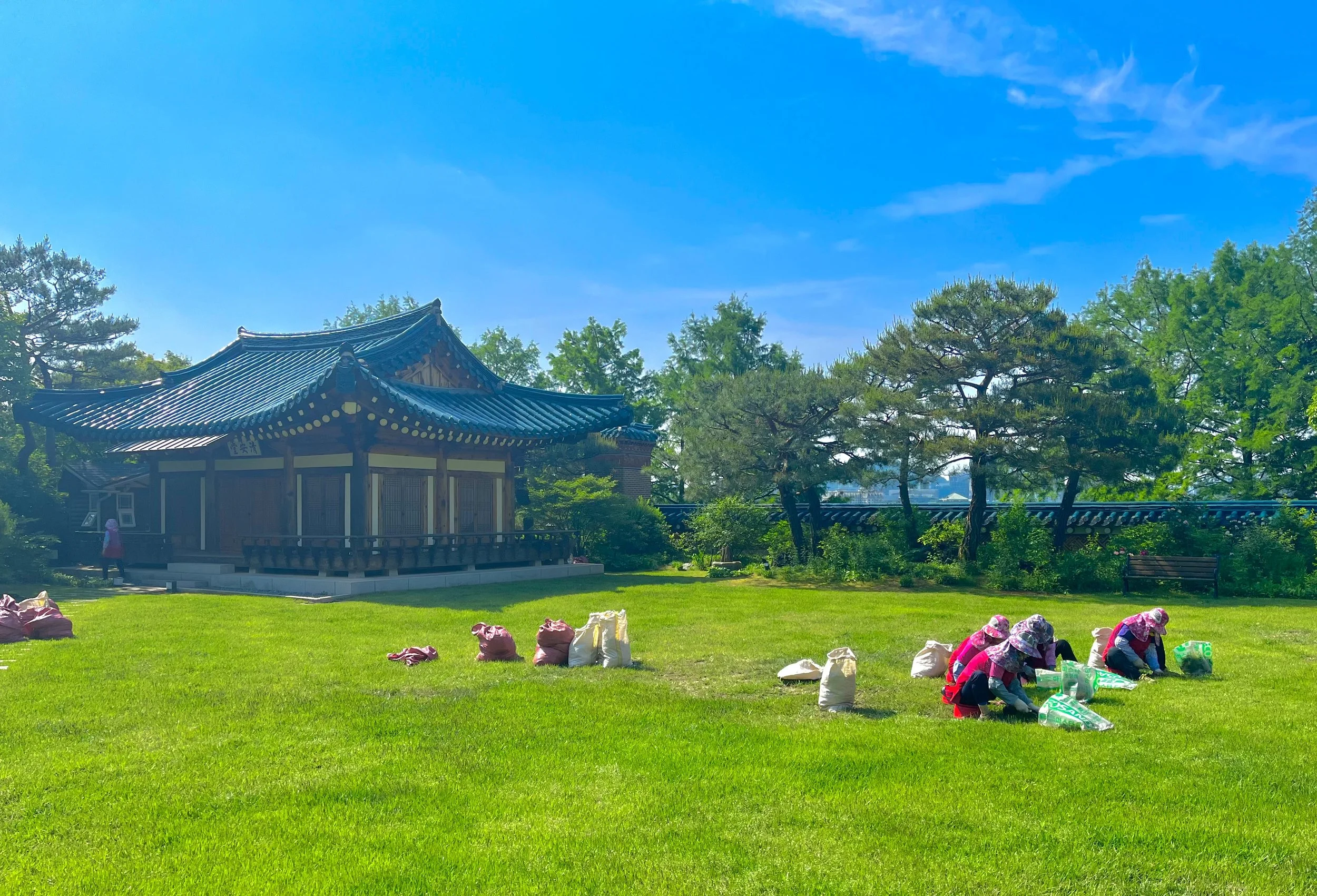 About this photo: During my visit to Seoul in 2023, I had the unique opportunity to capture this moment at the Blue House, South Korea’s equivalent of the White House, which had been closed to the public for 75 years. I was struck by the sight of these women diligently tending to the fields. Their dedication was evident, making the landscape beautiful, whether or not the public saw their efforts. In that rare moment, they stood out like vibrant pink flowers against the lush green grass and bluest sky. I saw a reflection of myself in these women as well, working behind the scenes with others to create something beautiful.